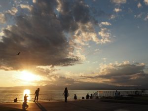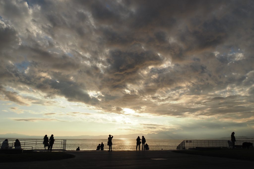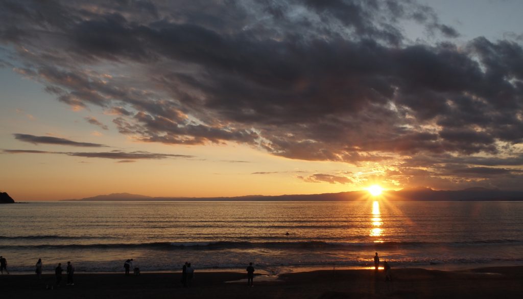 夕方16時を過ぎた片瀬海岸には、陽が沈むまで海で過ごす人が次々と集まってきました。