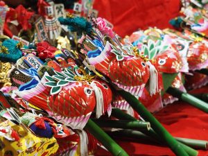 新年に向けて達磨や熊手などの縁起物のお店、焼きそばなどの屋台も並びます。