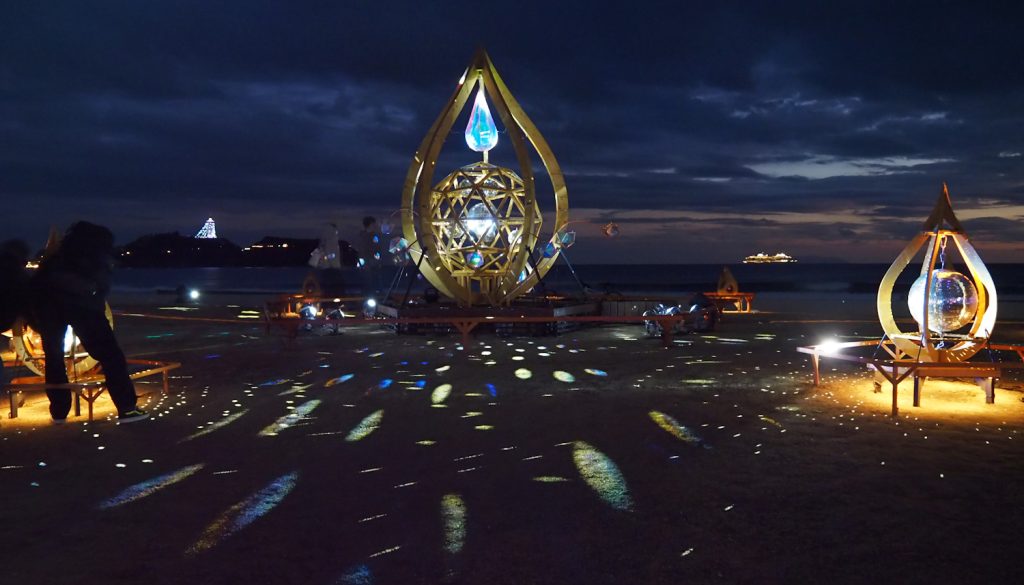 ミラーボールなどのイルミネーションを見に、家族連れも集まってきます。