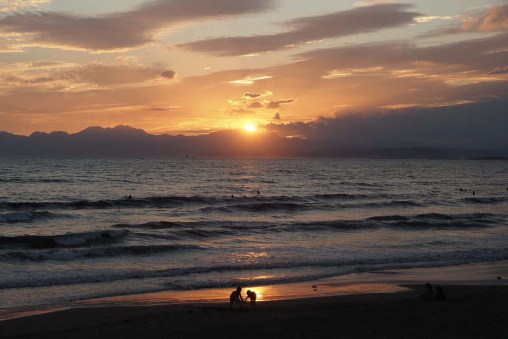 夕方、片瀬西浜まで行ってみると、たくさんの人が夕陽を眺めて海で過ごしていました🌊