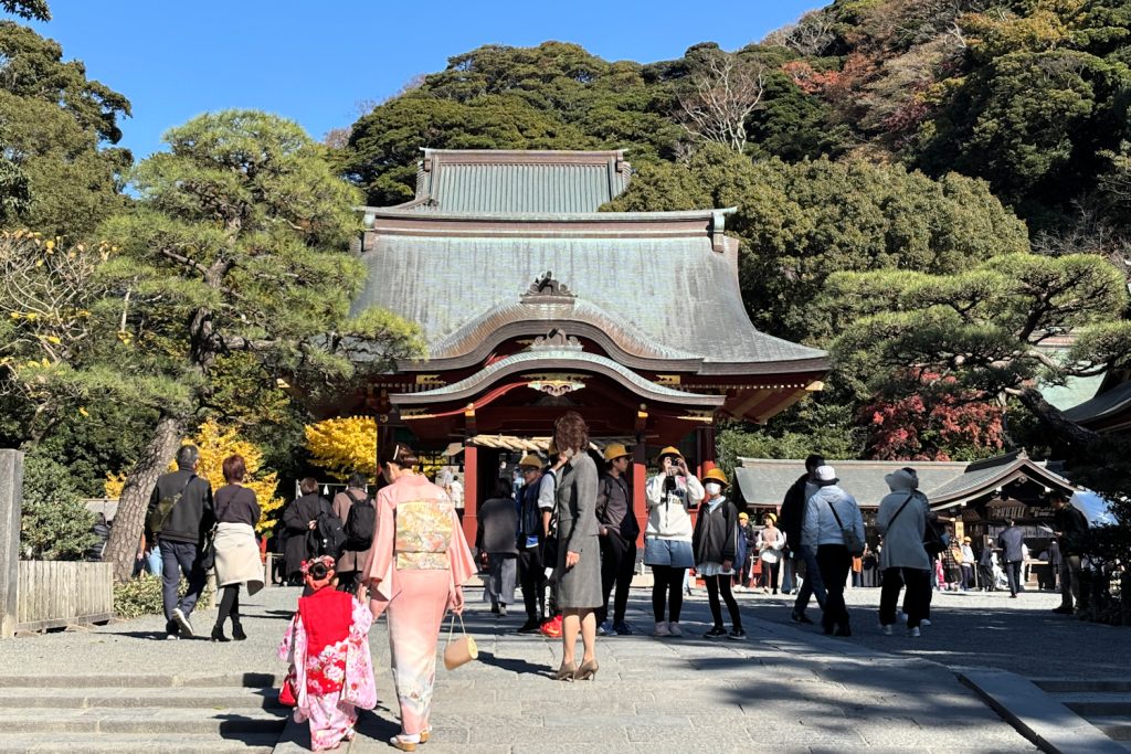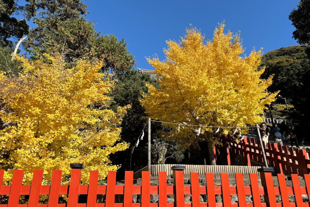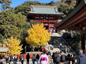 鎌倉の銀杏が見頃を迎え、本殿に上がる石段横で、この美しい黄葉が見られるのは感動です✨
